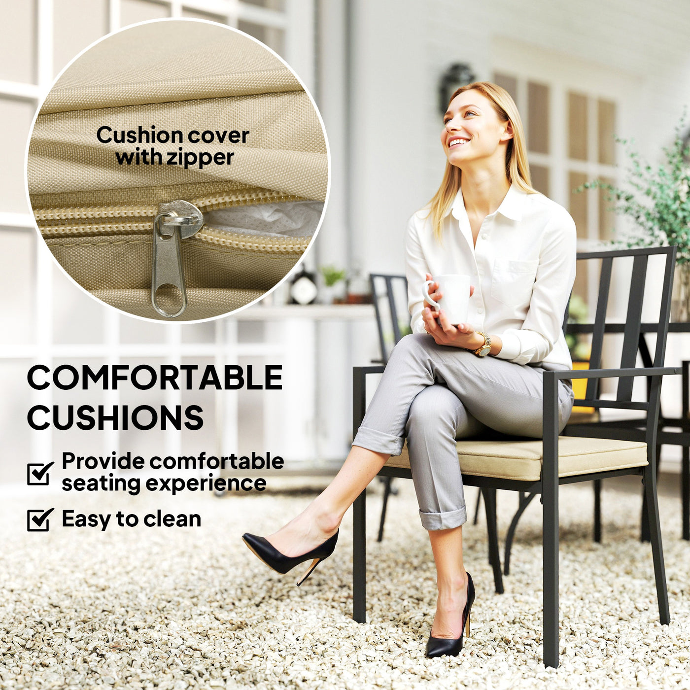 Outsunny 5 Pieces Garden Dining Set with Cushions, Outdoor Patio Table and 4 Stackable Chairs, Metal Top Table with Umbrella Hole, Black - Black