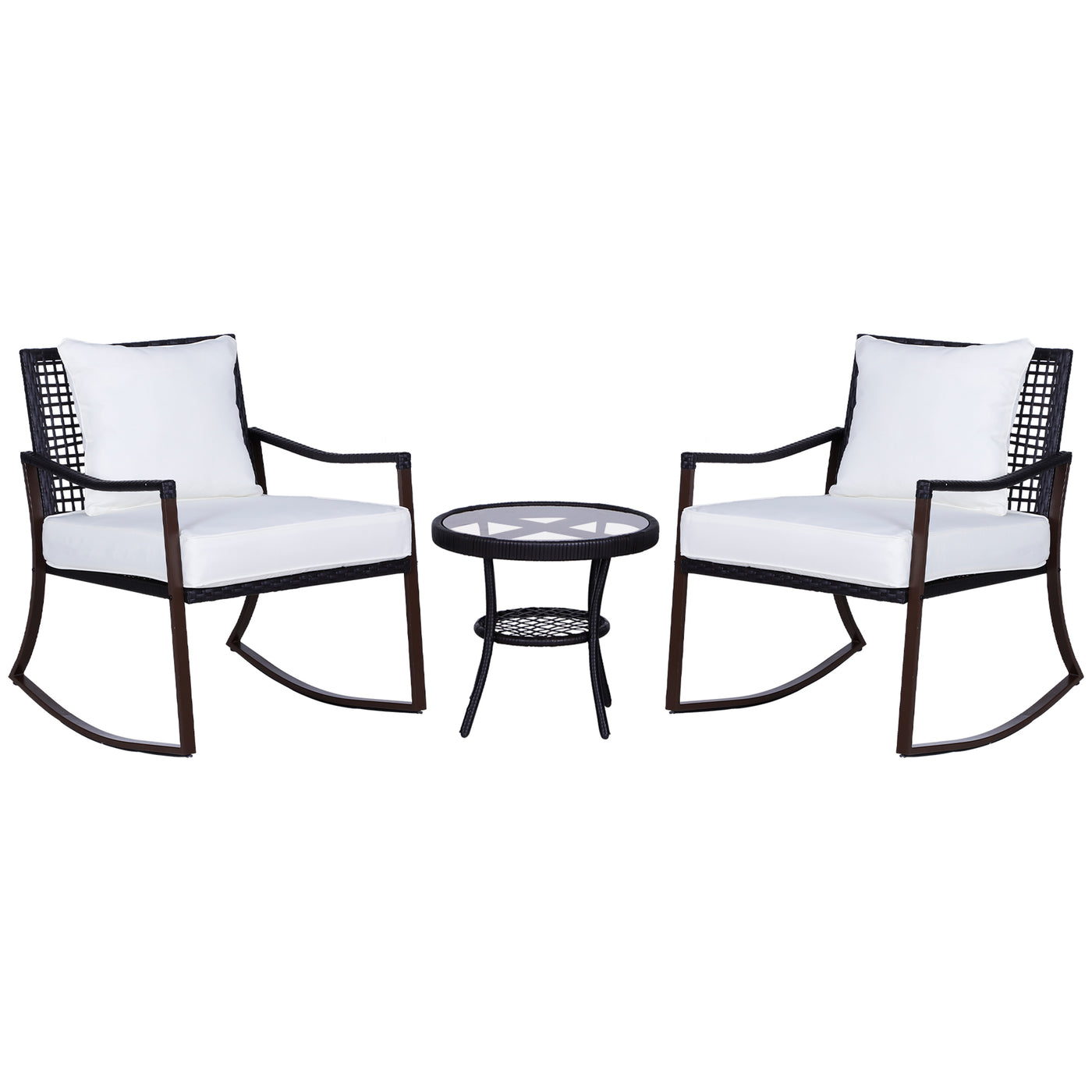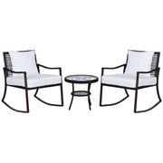 Outsunny Rattan Bistro Set, 3 Pieces Wicker Garden Furniture Set with Rocking Chairs and Round Glass Top Coffee Table, Small Balcony Furniture with Cushions for Outdoor, Porch, Brown - Brown, Cream White