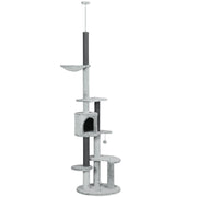 PawHut 255cm Floor to Ceiling Cat Tree with Scratching Posts, Height Adjustable Cat Tower with Hammock, House, Anti-tipping Kit, Perches, Toys, Grey - Grey