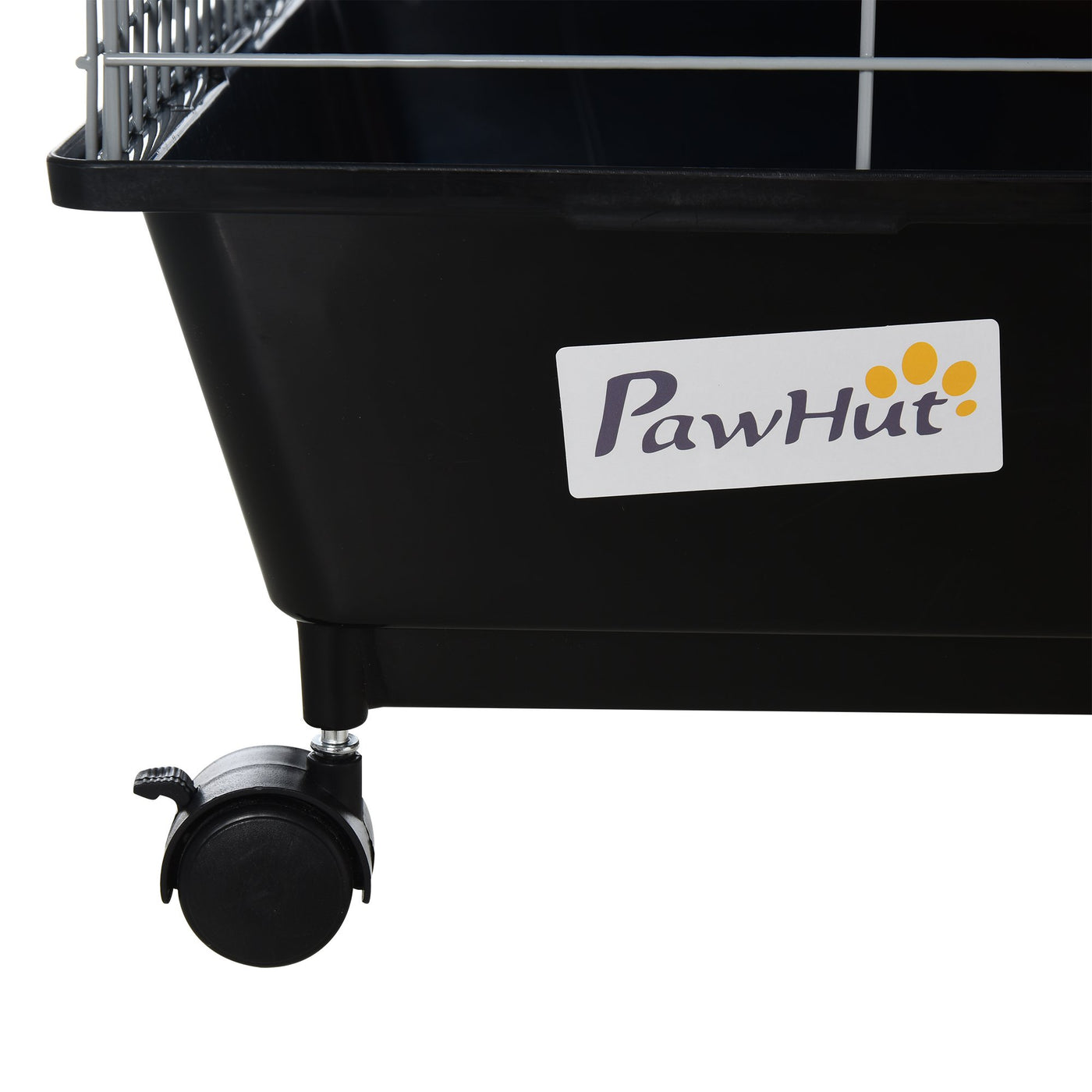 Give your small pet their own place to chill the day away with this cage from PawHut. It's made with a 40x89cm living area, protected by metal wire casing, keeping them safely inside and allowing the air to flow through. Inside features a small platform with a food bowl, a water bottle, a ramp and a hay feeder, giving them everything they need to stay happy, hydrated and fed. With a large front door and top door for easy access, it's finished with a deep base, which collects dirt and debris, and four wheels to move around easily. Perfect for Rats, Hamsters, Chinchillas and more.