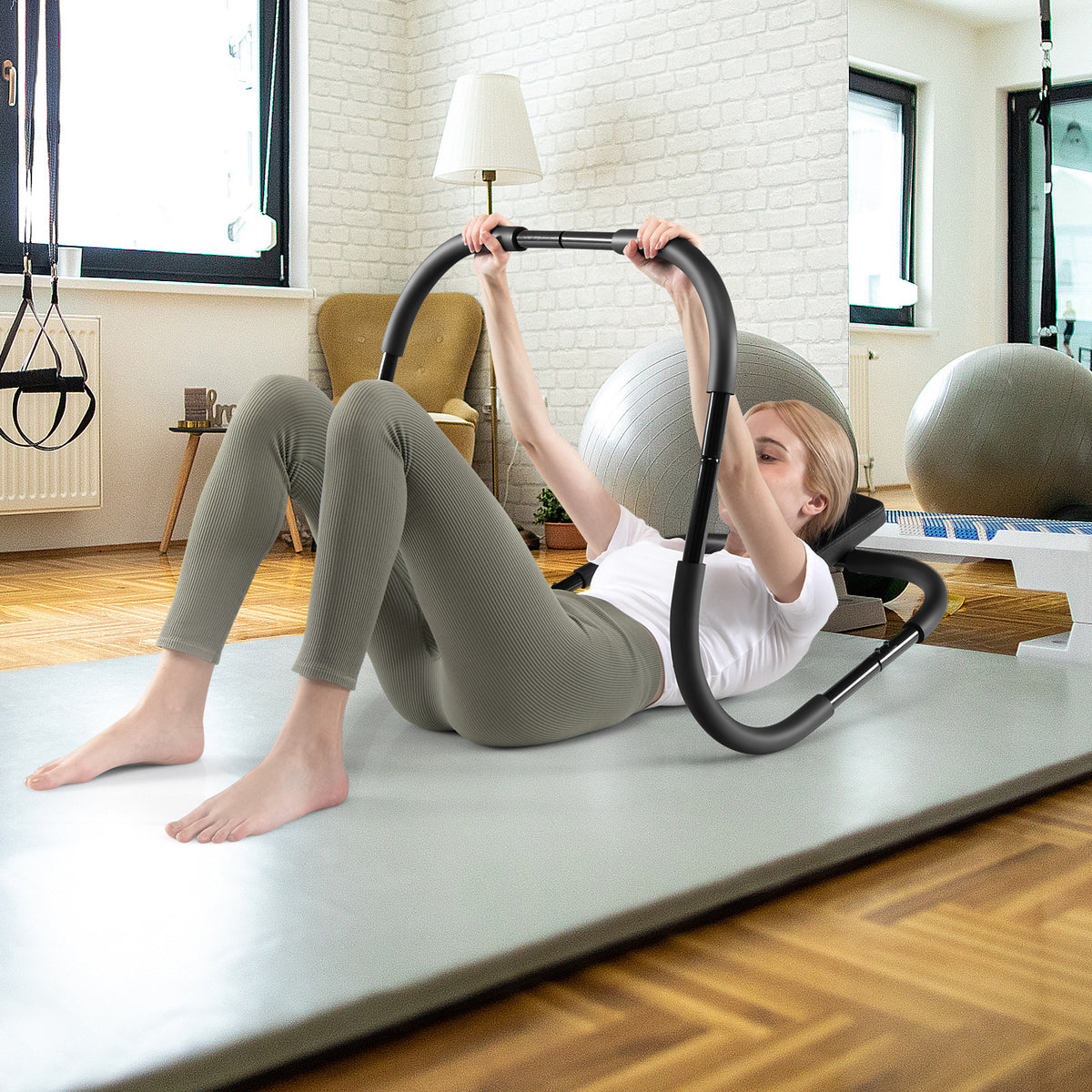 With this multifunctional AB trainer, you can do a variety of workout, like the standard crunch, side crunch, raised leg crunch, push-ups, triceps training and more. It helps to train not only your abdominal muscles, but also your chest, arms, hip, back and legs. The heavy-duty steel tube frame and tight-screwed connection make this AB cruncher stable and strong enough to hold up to 100 kg. The comfortable headrest and soft foam grips allow you to enjoy your workout without feeling tired. With the compact size, you can place this full body workout equipment in your home gym and enjoy sweating without going out. It is also lightweight, so you can take it anywhere with little effort. Foam Grip and Protective Cushion: Covered with soft foam, handles provide a comfortable touch, so as to bring an excellent fitness experience. Additionally, the cushioning headrest can reduce strain and support your head, helping you to form a correct exercise posture, so you can focus on training the muscles of the abdomen and legs. Versatile Use for Body Strength: The roller exerciser offers multiple training options for diverse muscle groups, such as leg raise, push-ups, crunches, stretches, allowing you to train your back, shoulders, arms, chest, and other parts of your body effectively. This abdominal trainer is aimed to exercise your muscles in all directions. Sturdy and Durable Construction: Made of sturdy steel material, this Ab trainer is equipped with a super tough and durable frame for long-term use. The stable structure and high-strength materials enable it to withstand weights up to 100kg without deformation, thus you do not need to worry about the stability and safety of the Ab cruncher during training. Perfect Equipment for Indoor Use: By stretching or stimulating muscles, the Ab cruncher can better promote blood circulation and metabolism, thereby improving the body's immunity and bringing you a healthy life. Meanwhile, this Abs trainer is ideal for indoor muscle strength training, which means you can enjoy professional personal training at home or office. Easy Assembly and Storage: A detailed assembly instruction sheet is attached to the package. It takes about one person to finish installation according to the user's manuals. When not in use, it can be disassembled in a few minutes without tools, which is convenient for storage in any small capacity space.