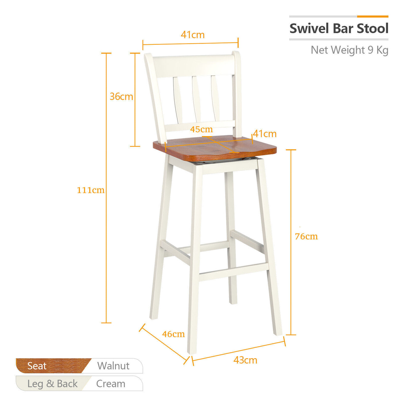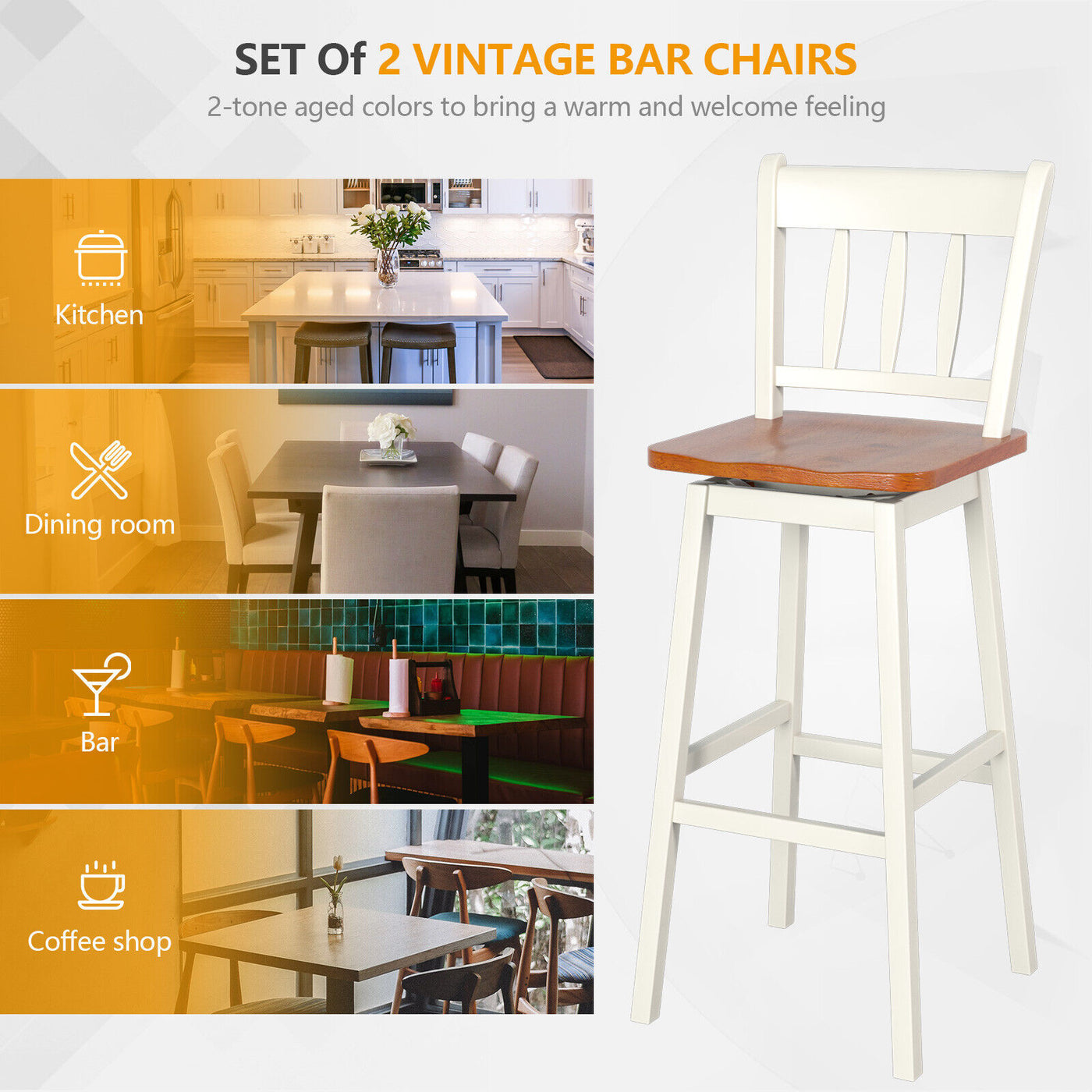 Set of 2 Rubber Wood Swivel Bar Stools with Backrest and Footrest-Cream