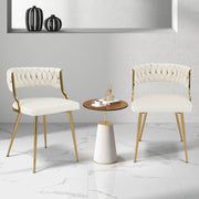 This velvet dining chair set is a perfect combination of style and comfort for your dining area. The exquisite appearance of these chairs is enhanced by the gorgeous golden metal frame, adding a touch of elegance to your space. The unique knitting process used in the woven back creates a visually stunning design that is sure to impress your guests. More than that, the dining chair is covered by soft velvet fabric and filled with high-density sponge, which can not only provide exceptional support but also add a luxurious touch. Built with strength in mind, the chair features electroplated metal tubes that guarantee a strong structure and a weight capacity of up to 140kg. Whether you use them in the dining room, kitchen, living room, or office, they effortlessly blend in with any decor style. Luxurious and Elegant Appearance: The velvet dining chair set features a gorgeous golden metal frame, adding a touch of elegance and sophistication to any dining area. Moreover, the woven back with a unique knitting process also makes the chair more exquisite and stylish. Ultimate Comfort: The upholstered dining chair with soft velvet fabric covering not only adds a luxurious feel but also offers a smooth and velvety texture that is delightful to the touch. Furthermore, with the high-density sponge filling, the seat provides an ultra-comfort sitting experience. Sturdy and Stable Structure: The accent side chair is supported by a rustproof electroplated metal tube, ensuring a large loading capacity of 140 kg. Besides, featuring anti-slip footpads, the chair is also stable enough while protecting your floor from scratching. Ergonomic Design and Versatile Use: The curved backrest and wide seat perfectly fit your body curve for better relaxation. Additionally, the versatile design makes them suitable for various settings, including dining rooms, kitchens, offices, and more. Easy Assembly: The velvet dining chair measures 50 x 50 x 74 cm(L x W x H) and the seat height is 49 cm. In addition, with its simple structure and clear illustrations in the user's manual, you can easily set it up.
