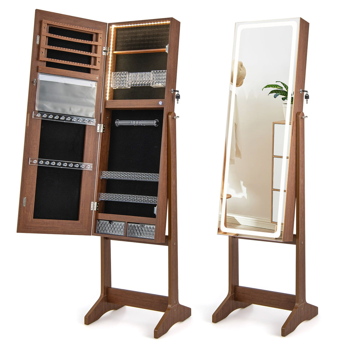 This freestanding mirrored jewelry armoire will make your life much easier! Equipped with 72 earring slots, 24 earring stud holes, 20 necklace hooks, 65 ring slots, 1 zippered plastic bag and 1 bracelet rod, this jewelry cabinet can organize all your jewelry properly. Plus, the lipstick tray, 2 shelves and 2 drawers that are all made from acrylic offer extra storage space for your makeup, skin care products, etc. To keep your belongings well protected, the jewelry armoire adopts a lockable door and soft velvet lining inside. More importantly, the touch screen full-length mirror with 3-color LED lighting can bring light to your room, while the built-in 3-color LED lights make it easier for you to choose the jewelry in the dark. Besides, there are 3 holes on each side of the stand, allowing you to adjust the tilt angle of the jewelry cabinet to get a better view. Large Capacity and Classified Storage: This jewelry cabinet comes with 72 earring slots and 24 earring stud holes, 1 zippered storage bag, 20 necklace hooks, 65 ring slots, 1 acrylic cosmetics and lipstick box, 1 bracelet rod, 2 removable acrylic storage shelves, 1 fixed storage shelf and 2 acrylic drawers to keep your jewelry organized and easily accessible. External and Internal LED Lights: The standing jewelry armoire features a lighted external full-screen mirror, which has 3 color temperature options: cool white, warm white, warm yellow. Plus, the built-in dimmable LED strip also has 3 colors of lights for you to choose: blue, blue and white mix, yellow. And you can long press the button to adjust the brightness. Note: please connect the included power adapter before using. Well-made and Thoughtful Design: Equipped with a lockable door with keys, the mirrored jewelry cabinet keeps every piece of your jewelry safe. Moreover, the back anti-tipping strap, reinforced base and anti-slip foot pads at the bottom ensure high stability and security. 2 in 1 Adjustable Jewelry Cabinet: This multipurpose freestanding jewelry cabinet and full-length mirror can perfectly meet all your dressing and jewelry storage needs. In addition, the jewelry armoire features 3 adjustable tilt angles, allowing you to find the most suitable angle for you. Perfect Gift for Your Beloved One: Combining elegant appearance and large storage capacity, this jewelry organizer armoire with LED lights is the ideal gift for your wife, mother or girlfriend. What's more, the cabinet body is pre-assembled for a hassle-free setup.