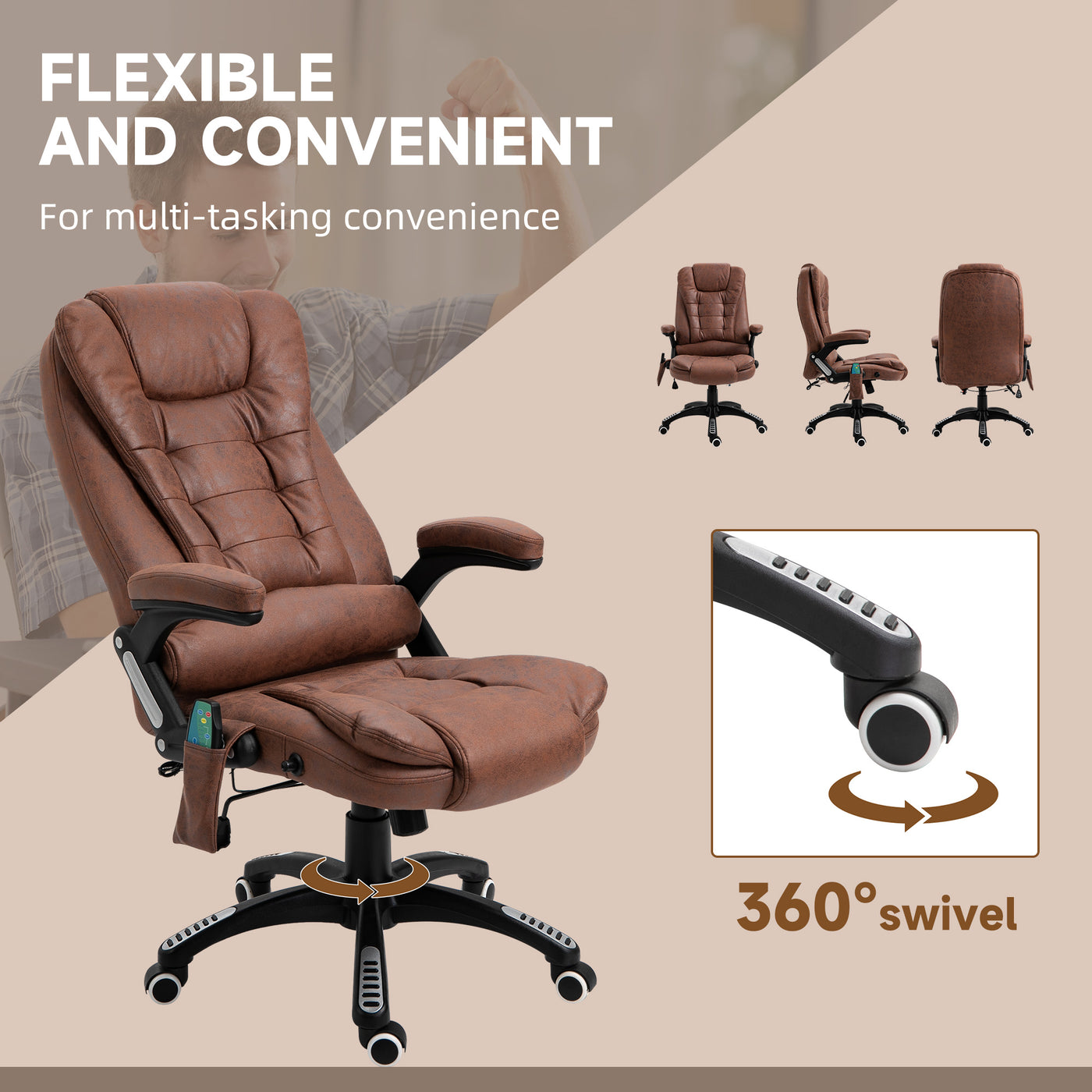 Vinsetto Massage Recliner Chair Heated Office Chair with Six Massage Points Microfiber Cloth 360° Swivel Wheels Brown - Brown