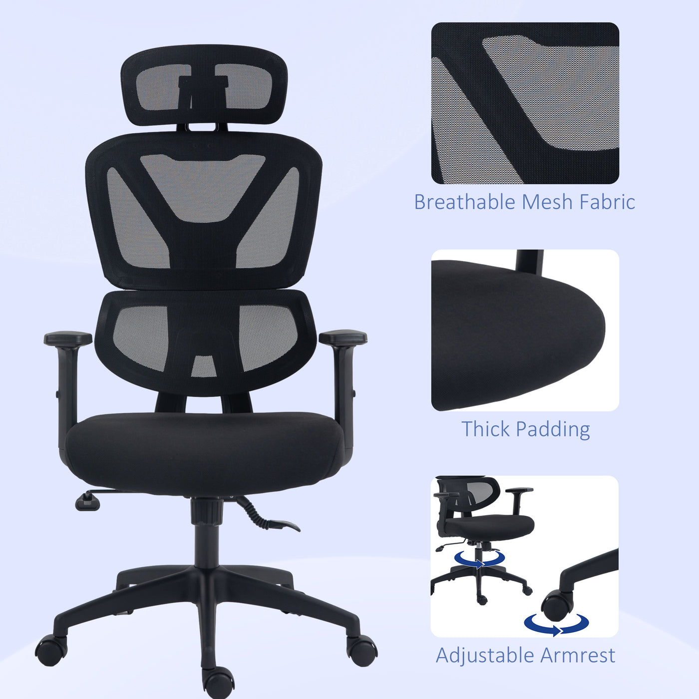 Vinsetto Mesh Office Chair, Height Adjustable Desk Chair with Lumbar Support, Swivel Wheels and Adjustable Headrest, Black - Black