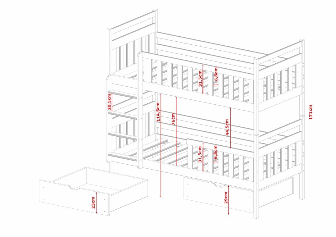 What better way to keep young ones close than with the Monika wooden bunk bed? This cozy unit features two spacious storage drawers underneath the bed, and a universal ladder that can be attached at either side. Moreover, at the upper and lower floors, safety rails will keep the little ones from toppling out, and ensure peace of mind. The Monika bunk bed can be bought with or without a mattress.