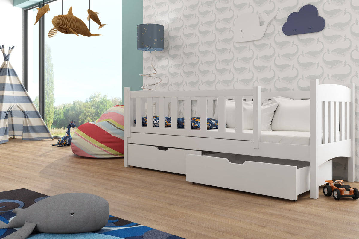The Gucio single bed is stylish and practical. Its head and footboard are nicely curved for a modern look, and the sleeping area is secured with long guard rails. In addition, the bed comes with two spacious storage drawers for keeping small items and bedroom essentials out of sight for a neat and decluttered bedroom.