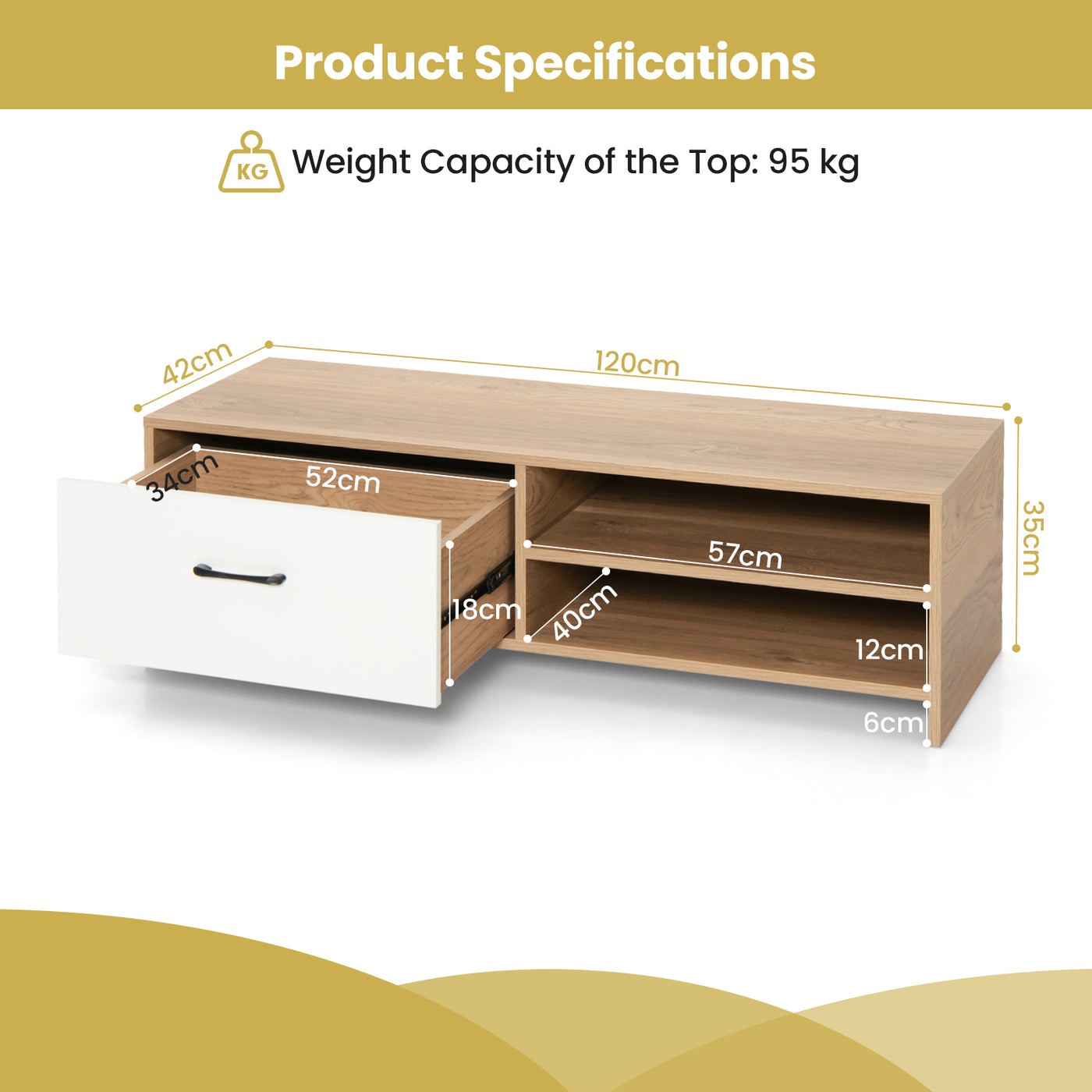 Colour: White & Natural Material: MDF, Engineered Wood Overall Dimension: 120 x 42 x 35 cm (L x W x H) Inner Size of Drawer: 52 x 34 x 18 cm (L x W x H) Size of Each Open Shelf: 57 x 40 x 12 cm (L x W x H) Load Capacity of Tabletop: 95 kg Net Weight: 25 kg Box Qty:1(May vary by batch)Package Includes: 1 x TV Stand 1 x Instruction Manual Installation Video