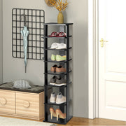 Made from P2, premium MDF, which have been coated with a water resistant black covering, this vertical shelving unit is ideal for shoes although it could be used as a shelving unit for ornaments or books. The vertical storage is ideal when space is limited and it can be used in the hallway, porch, bathroom or any room where storage like this is required. This industrial vertical shoe stand will be an ideal candidate if you are looking for a shoe rack, do not hesitate to place an order. 7-Tier Neat Storage: This shoe tower provides you with 7 vertical shoe storage shelves. The upper shelves are for slippers, sneaker kinds of shoes, while the lower shelves have more room for high heels and high shoes. And you can detach one board to create widened spaces for high boots. Stable Structure: Using P2 MDF, this shoe stand is resilient and odour-free. The square base keeps the shoe tower stable and balanced, yet takes up little valuable floor spaces. And there is a vertical panel at the back to keep the shoe shelf together firmly. Multifunctional Shelf: Besides arranging your shoes, this storage shelf is also a neat organizer for your bathroom essentials of the towel, shampoo, bathrobe, and more. A plants rack or a bookshelf on your balcony and living room is also a doable plan for this shoe tower. Water-resist Surface and Rustic Colour: This simple shoe rack has a timeless style coming from the mid-century. Rich wooden grains also lend charm to the whole furniture. And the surface has been treated with a water-resistant coating for durability. Easy to Assemble: Though requiring some manual steps, the installation is kept to the minimum amount of trouble. And detailed and easy-to-follow manual guidance also helps to a successful assembly. In addition, the boards and parts are labelled with numbers for clarity.